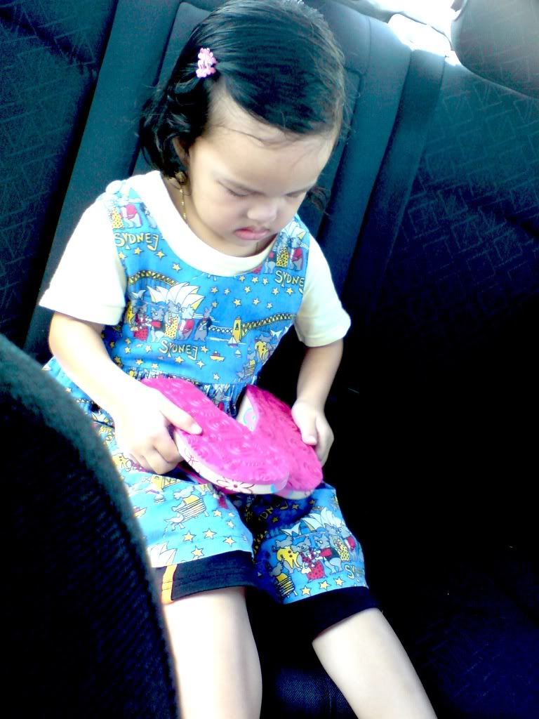 semalam belikan kakak selipar di angsana, kebetulan aisyah tak ikut.balik dari angsana, aisyah menangis nak selipar macam kakak.